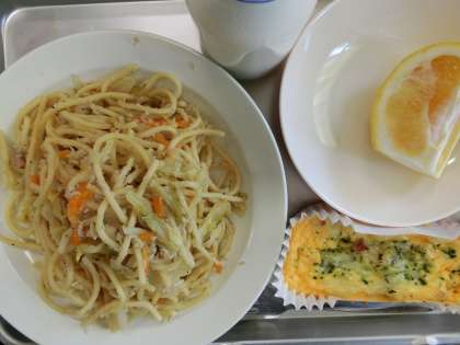春キャベツとしらすのスパゲッティー 牛乳 フレンチエッグ 河内晩柑
