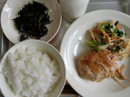 ☆今日は東京都八丈島産のむろあじを使ったハンバーグでした。豚ひき肉:むろあじミンチ:豆腐を、3:5:1の割合で混ぜて使いました。上には、えのきたけと玉ねぎの和風ソースをたっぷりかけました。