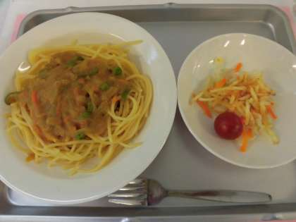 カレークリームスパゲッティー 牛乳 じゃがいものハニーサラダ チェリートマト