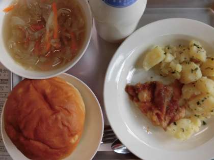 パインパン 牛乳 鶏肉のステーキソースがけ パセリポテト ジュリアンスープ