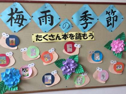 図書室までの階段や図書室内には、図書ボランティアの方が工夫して掲示してくださった様々な掲示物があります。