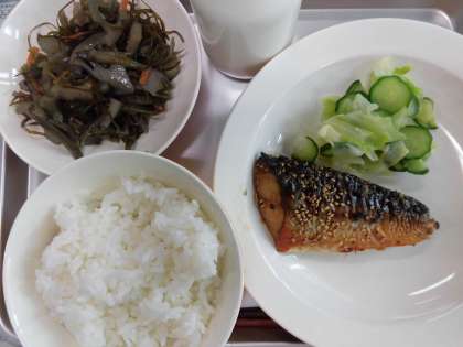 ご飯 牛乳 さばの七味焼き 野菜のひとしお 刻み昆布の五目煮