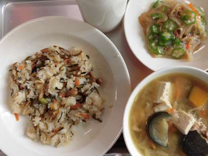 磯おこわ 牛乳 夏野菜の豚汁 オクラと野菜の和えもの