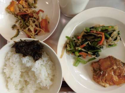 ご飯 のりの佃煮 牛乳 さばのピリ辛ソースがけ おひたし 野菜チップス