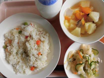えびピラフ 牛乳 野菜のイタリアンドレッシングかけ フルーツみつ豆