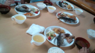 昼間、自分たちで、とったマスを、きれいに、はらわたを取り除き、焼いていただきました。夕食で、丸ごと食べました。