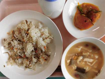 豚肉とごぼうのご飯 牛乳 かぼちゃのそぼろ煮 なめこのみそ汁