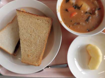 2色サンド(ブルーベリージャム、チーズ) 牛乳 ポークシチュー りんご