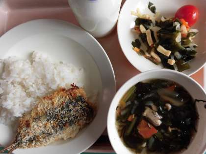 ☆今日10月4日はいわしの日です。いわしの旬は秋。いわしはそのまま食べるだけでなく、煮干し、オイルサーデ—ディン、つみれなど、色々な加工品にもなります。今日はせたがや食育メニューを参考にしました。