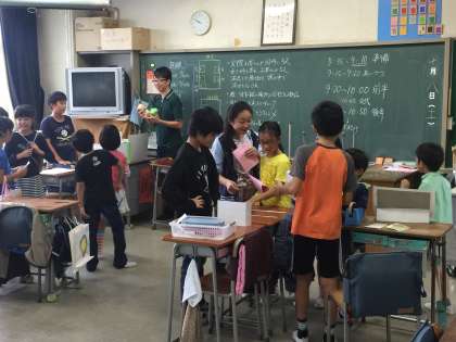 2年生から6年生までが工夫したお店を出しました。前半後半に分かれて、お客さんとスタッフを交代します。1年生はお客さんでお店を回ります。