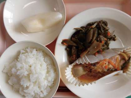 ご飯 牛乳 さけのチャンチャン焼き 茎わかめのきんぴら 梨