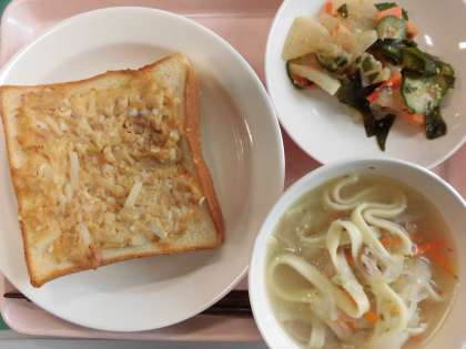 ツナトースト 牛乳 ヌードルスープ わかめサラダ