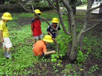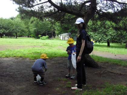 前回は行かなかった林の日陰の部分などにも行き、木や草、地面やそこにいる虫などの様子を観察し、ダンゴムシやカナブン、キノコや夏の草花など、いろいろなものを見つけてきました。