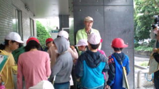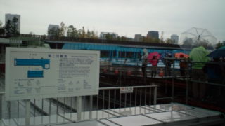 まずは、世田谷区のみんなも、お世話になっています。芝浦水再生センターです。あいにくの雨ですが、傘を差して、外の施設も、見ています。