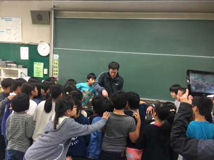 中学校の先生と協働して行う授業です。中学校の先生が登場すると子どもたちは大喜びです。