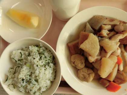 ☆今日のおでんの大根は、大塚農園さんでとれた、せたがやそだちの大蔵大根でした。甘くてみずみずしい、美味しい大根でした。大蔵大根の葉は、じゃこと一緒にゴマ油で炒めて、ご飯に混ぜました。また、今日のりんごは、葉取らずりんごでした。葉を取らずに育てるため、見た目に色むらができますが、葉で作られた養分が果実に十分蓄えられ、とても甘くなります。