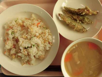 子ぎつねご飯 牛乳 わかさぎの磯部揚げ 味噌汁