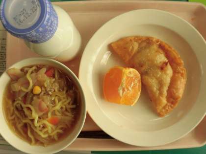 ☆今日は新メニューのしょうゆラーメンでした。麺をスープの中に入れると、麺が伸びて汁を吸ってしまうので、今までラーメンの時はつけ麺にしていました。今日は、麺を先に茹でて食缶に入れてから、給食のワゴンを上げる直前にラーメンスープを入れてみました。麺は伸びませんでしたが、食缶の下の方で麺が固まってしまい、盛りつけ時に麺が切れてしまったのが欠点でした。次回、また他の方法を考えたいと思います。