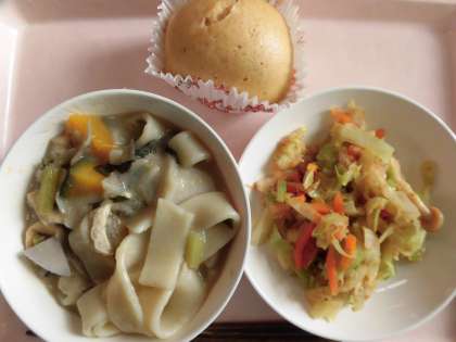ほうとう 牛乳 キャベツのゆずおかか和え まめまめ蒸しパン