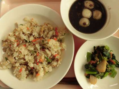 ☆1月11日は鏡開きです。鏡開きは、神様にお供えした鏡餅を、木槌などで叩いて割り、家族みんなで食べて無病息災を願う行事です。今日はそんな鏡開きにちなみ、白玉汁粉にしました。また、今日の和えものには春の七草である、せりとすずしろ(大根)を入れました。