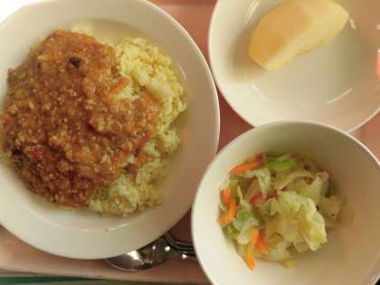 キーマカレーライス 牛乳 キャベツサラダ りんご