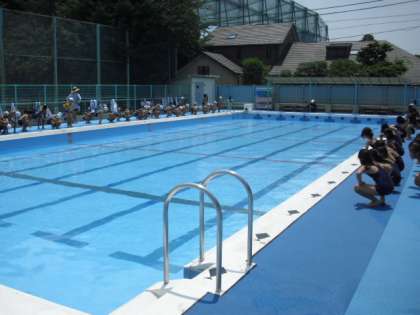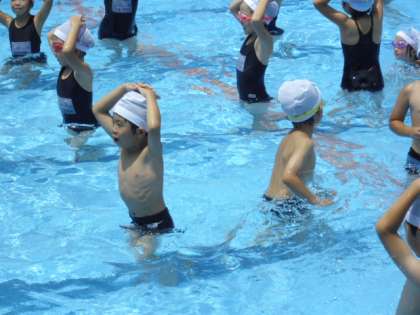プールでの水泳教室にはたくさんの子どもたちが来ています。