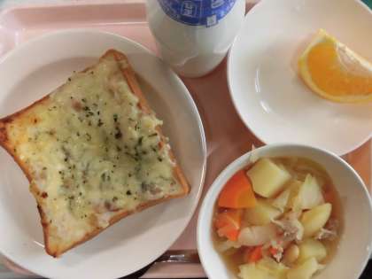 クリームピザトースト 牛乳 白いんげん豆の田舎風スープ 八朔