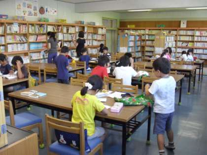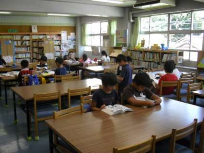 夏休み前半の図書室開放2日目。外は猛暑の中、子どもたちは、図書室で、思い思いの本を読んでいます。ボランティアの保護者の方のおかげで、図書室が開放できています。
