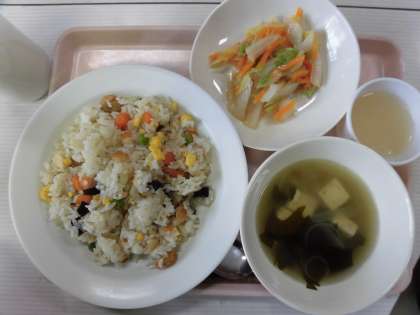 今日の献立は、チャーハン・牛乳・ラーパーツァイ・わかめスープ・リンゴゼリーです。