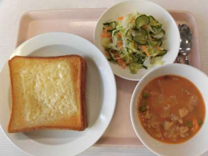 今日の献立は、チーズトースト・牛乳・鶏肉のトマトソース・フレンチサラダです。