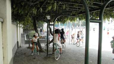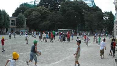 休み時間になると、校庭でたくさんの子どもたちが元気に遊んでいます。一輪車で遊んでいる子どもたちは、藤棚による日蔭を上手に使いながら遊んでいました。