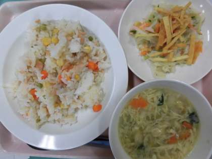 鮭ピラフ 牛乳 卵スープ(カレー風味) パリパリサラダ