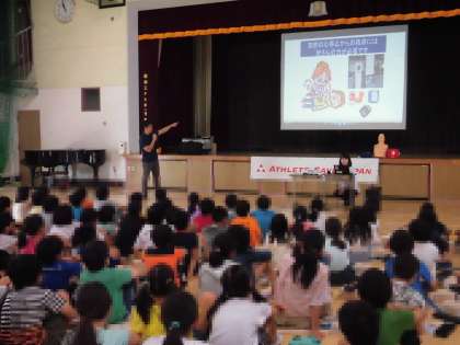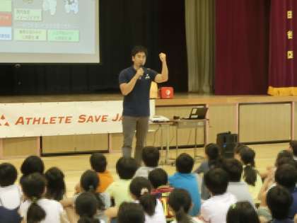 ライフセーバーの飯沼誠司さんが設立した、スポーツによる突然死をゼロにすることを目標とする団体「アスリート セーブ ジャパン」の協力を得て、5年生の「いのちの教室」が開催されました。
