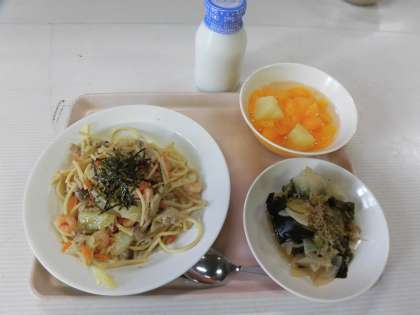 和風スパゲティ 牛乳 じゃこサラダ フルーツポンチ