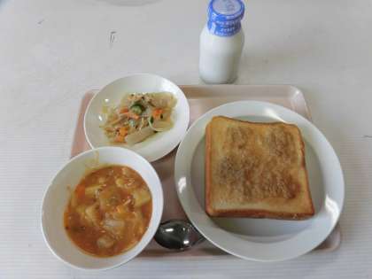 セサミトースト 牛乳 ハンガリアンシチュー こんにゃくサラダ