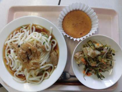 冷やしきつねうどん 牛乳 沖縄風野菜炒め かぼちゃのケーキ