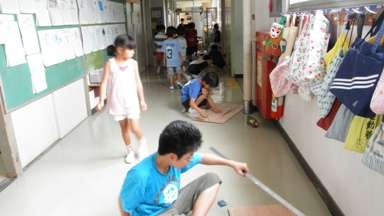 図工の時間に、6年生は自分が作った設計図をもとに、平板に線をかくなど椅子づくりを始めました。図工室だけでは狭く廊下でも取り組んでいたところ、1年生が集まってきました。1年生にとって6年生のすることは、興味津津です。