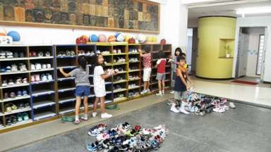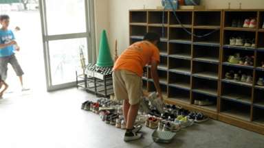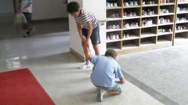 暑いときの掃除は、決して楽ではありません。でも、瀬田小の子どもたちは汗をかきながら協力して進めます。流しで仲よく並んで掃除をする4年生。靴箱掃除をしている5年生と1年生は、掃除の仕方が一緒です。きっと上級生が掃除の手順を教えてくれたのでしょう。