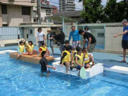 8月27日(日)に開催される「アドベンチャー in 多摩川いかだ下り大会」で乗船するいかだの進水式を実施しました。