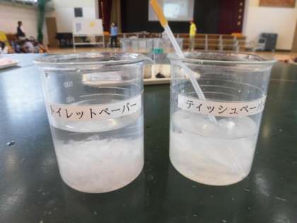 実験は「沈殿実験」「雨水ます実験」「トイレットペーパーとティッシュペーパーの実験」です。