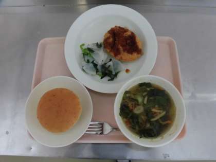 セサミパン 牛乳 コロッケ(おから)野菜のレモンかけ 春雨スープ