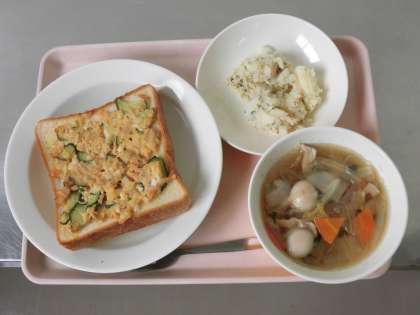 ツナトースト 牛乳 白菜と春雨のスープ じゃがいもの香味あえ