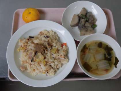 秋の香りご飯 牛乳 里芋の甘辛煮 みそ汁 みかん