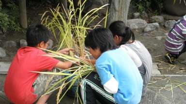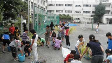 収穫の秋です。こうべを垂れている稲を刈り上げる5年生の様子です。スズメが激減しているせいか、鳥にやられることがめっきり減ってきました。