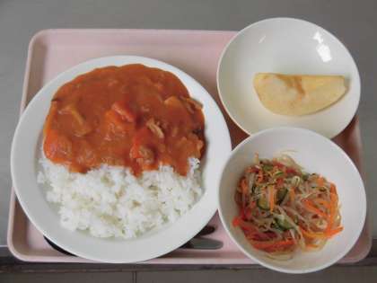 ハッシュドポークライス 牛乳 こんにゃくサラダ くだもの(王林)