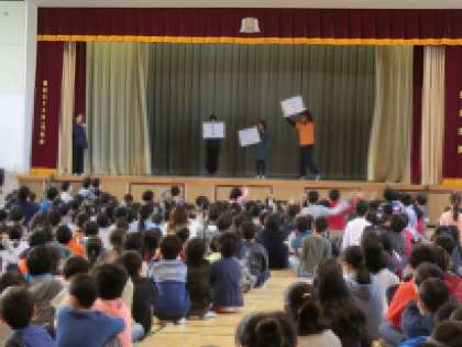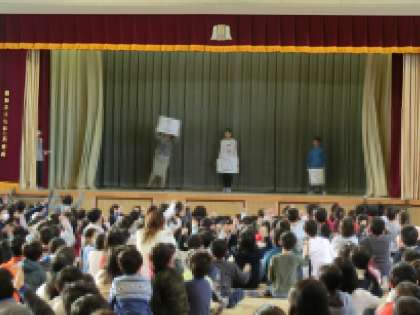 先生方や集会委員会の児童が幕に隠れて言葉を言い、○○先生は何番だったかをあてるゲームです。