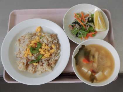 三食丼 牛乳 野菜のごま風味 みそ汁 くだもの(みかん)