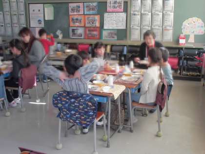 その後、ふれあい給食として、ゲストティーチャーと共に給食を食べました。