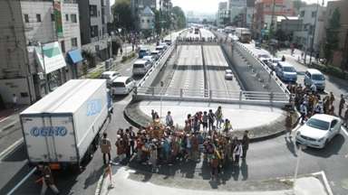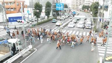 子ども神輿巡行では、国道246号線や環状八号線を横断します。瀬田ならではの光景です。