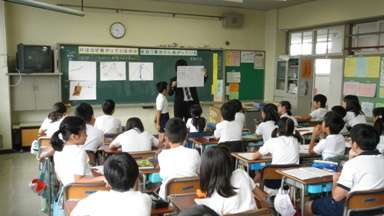川についてのある予想を立て、確かめ方をグループで話し合い、発表している様子です。難しい学習問題でしたが、子どもたちは一生懸命考えを出し合い発表することができました。